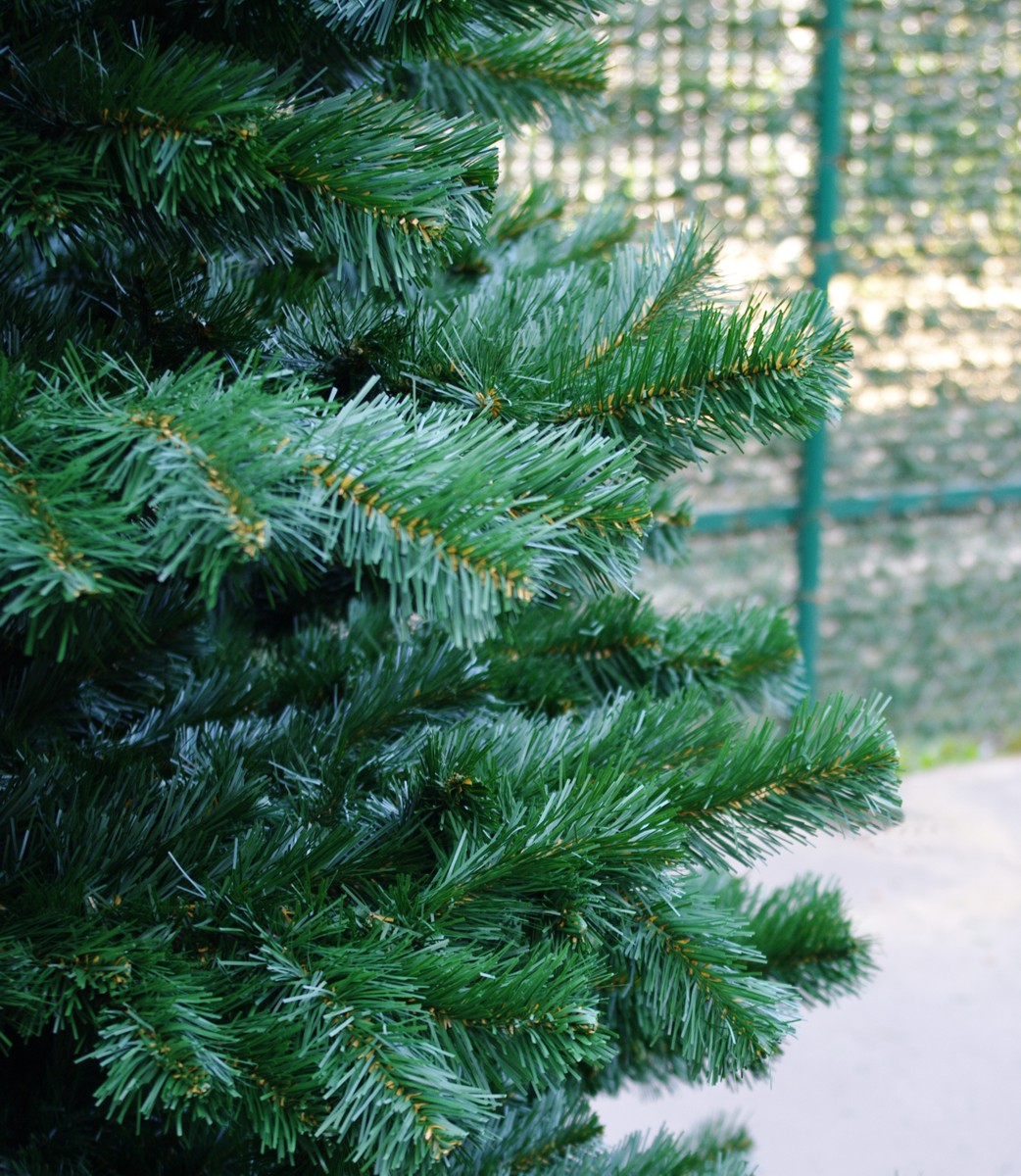 Крона в виде конуса, размах нижних веток 3150 мм, темно-зеленый цвет, хвоя пленка ПВХ, длина хвоинки 45 мм, ветви верхушки жестко прикреплены к стволу, ветви нижней части отдельно вставляются в пазы на стволе