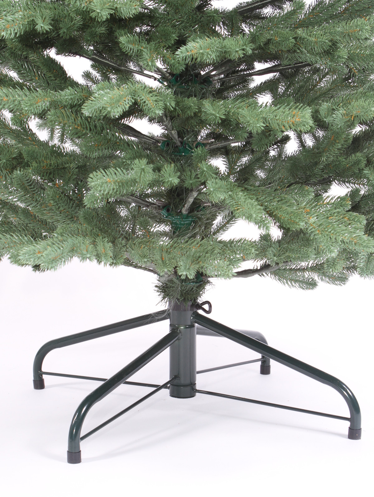 Ветки на стволе крепятся на шарнирах, опирается елочка на металлическую подставку. Литая PE в качестве материала веток – долговечная, отлично держит форму. Напольная комнатная елка имеет диаметр 102 см, вес – 14,1 кг.