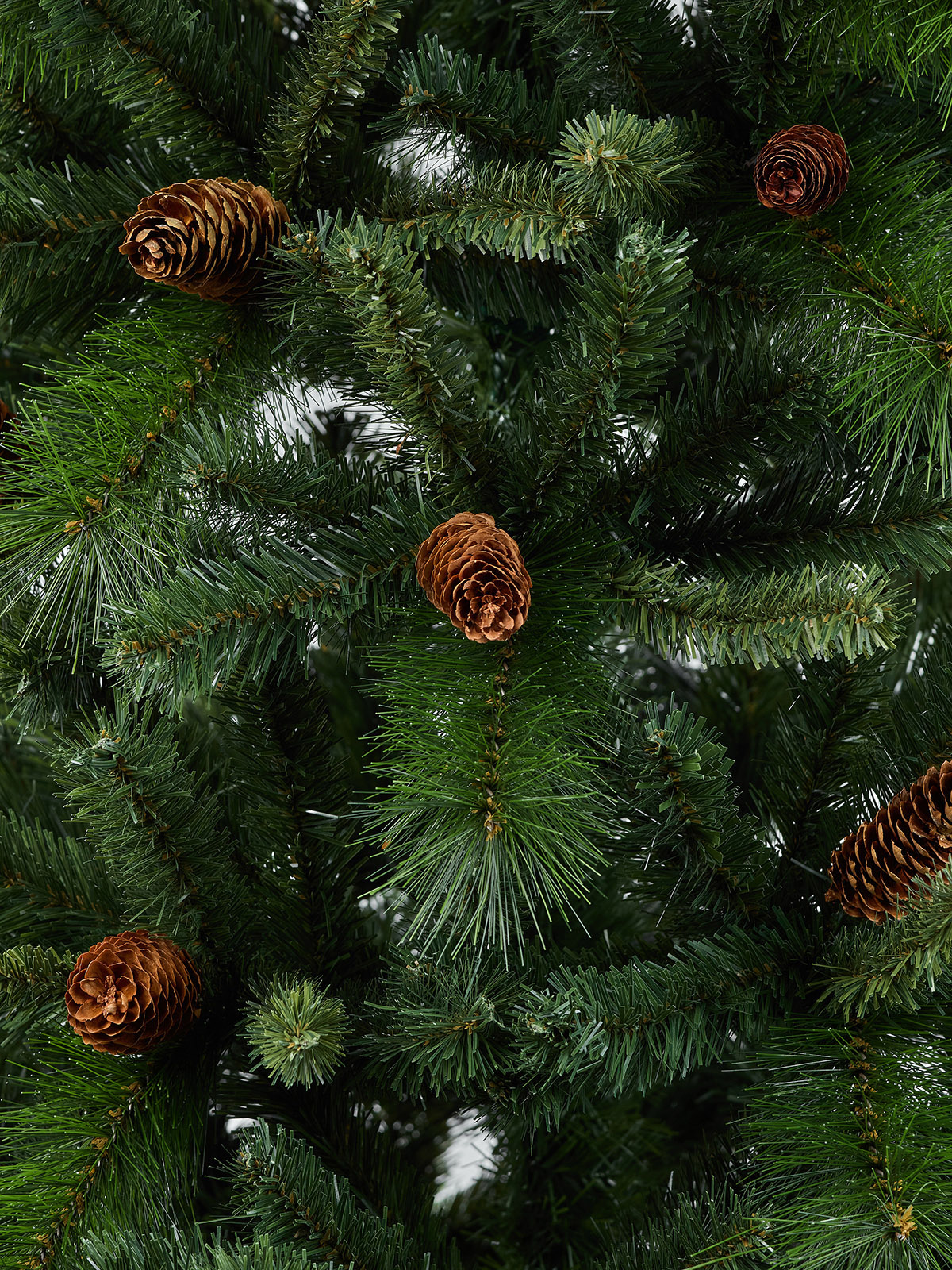 Новогодняя комнатная напольная елочка пирамидальной формы – смотрится, как настоящая, благодаря продуманному дизайну и использованным материалам. Изюминка модели – в наличии натуральных шишек, что придает деревцу особый шарм. Елка с длинной хвоей зеленого цвета, что и тут есть особенность – веточки и иголки неравномерно окрашены: некоторые зеленые, некоторые – светлее. Такой дизайн выглядит совершенно. Веточки крепятся на шарнирах, опирается ствол на металлическую подставку. Высота подходит для обычной квартиры со стандартными потолками. Для создания реалистичной хвои использованы леска и специальная пленка.
