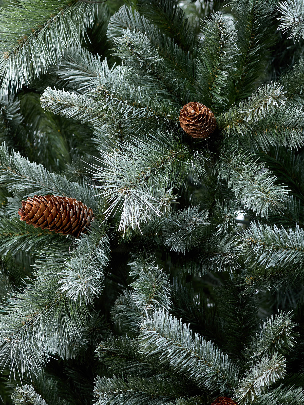 Новогодняя напольная елочка максимально напоминает живую, настоящую елку, которую только что принесли из леса. Чтобы создать ощущение праздника, подчеркнуть торжественность и натуральность модели, используют эффект заснеженности, инея на зеленых веточках с длинной хвоей. Финальный штрих – наличие натуральных шишек. Такая елочка отлично смотрится и без обилия игрушек. Ветки откидываются на шарнирах, крона густая. Для длинных иголочек используют два материала – специальная пленка и леска. Собрать и разобрать изделие можно за несколько минут – она будет служить вам годами. Опирается ствол на металлическую подставку